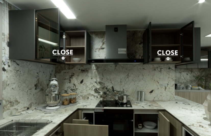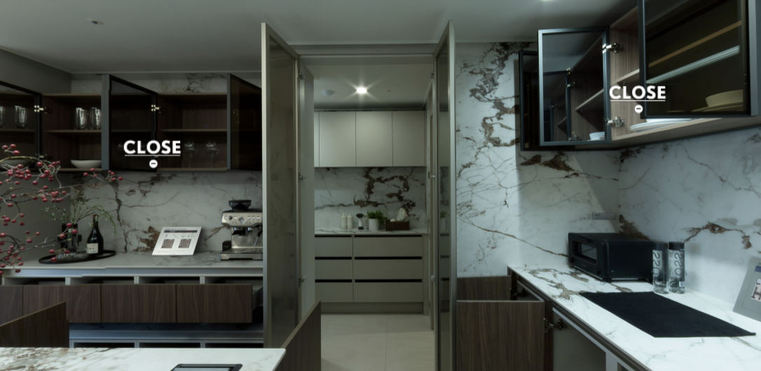 주방은 실사용자 중심으로 설계된 동선이 눈에 띕니다. 조리대와 아일랜드가 분리되어 있어 동시에 여러 작업이 가능하며, 상부장과 하부장의 깊이감 있는 수납 구조가 실용적입니다. 상판은 세라믹 소재로 고급스러움을 더했고, 일체형 싱크볼과 빌트인 가전이 깔끔하게 배치되어 있습니다. 특히 조명은 조리대 전면에 은은하게 설치되어, 음식 준비 시에도 그림자가 생기지 않아 밝고 쾌적한 느낌을 줍니다. 전체적으로 주방의 컬러 톤은 차분한 베이지와 크림 화이트의 조합으로, 고급스럽고 편안한 분위기를 완성합니다.