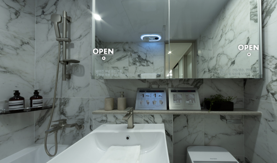 욕실은 밝은 그레이톤의 대형 타일로 마감되어 세련된 인상을 줍니다. 샤워부스는 강화유리로 분리되어 있으며, 미끄럼 방지 타일을 사용해 안전성도 확보했습니다. 세면대 하부에는 수납공간이 마련되어 있어 생활용품을 깔끔하게 정리할 수 있습니다. 수전과 샤워기 등 금속 마감은 은은한 매트 실버 톤으로 통일되어 고급스러움을 더했고, 환기창이 설치되어 있어 사용 후 습기 배출이 용이합니다. 전반적으로 욕실은 기능성과 미관을 모두 갖춘 구조로 설계되었습니다.